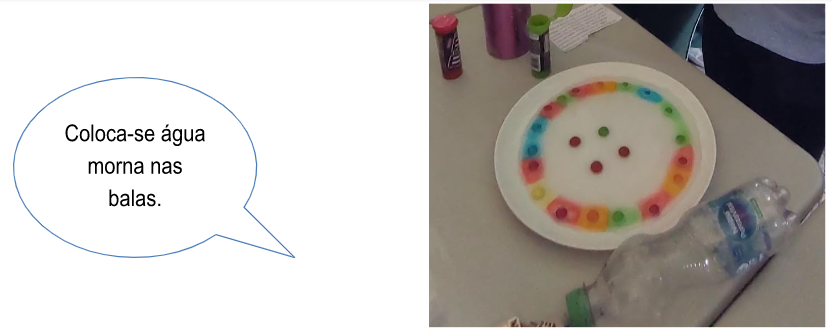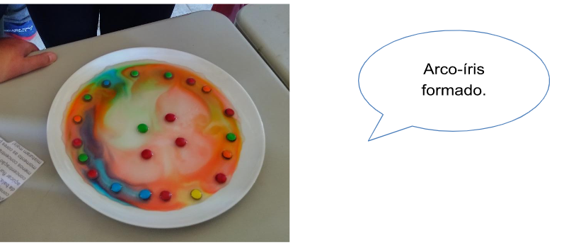 Modo de preparo da experiência: É só espalhar as balas na borda do prato e colocar água. O corante e o açúcar vão se dissolver na água e se espalhar pelo prato. Colocando M&Ms com água ela forma um arco íris, isto acontece porque os M&Ms são recobertos por açúcar e corante. Ao entrar em contato com a água o açúcar vai se desmanchando aos poucos, formando um arco íris. É interessante colocar as balas uma do lado da outra, para que assim o formato fique mais nítido.